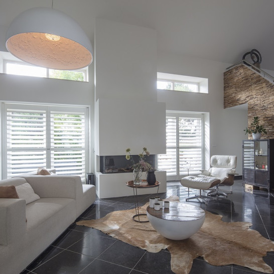 In einem Raum mit viel Betonflächen oder wenigen Möbeln sollte die Fensterdekoration die Akustik verbessern. Das ist beispielsweise mit Innenfensterläden aus Holz (Shutters) in Kombination mit Stoffgardinen möglich. Wählen Sie am besten Gardinen mit einer doppelten Stoffschicht, um den Schall so gut wie möglich zu absorbieren.